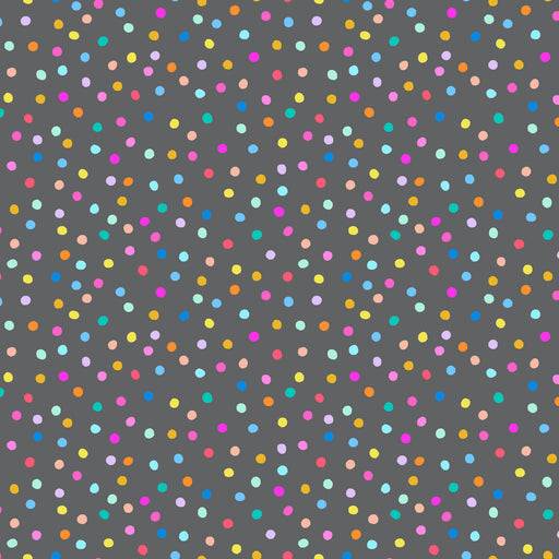 Rainbow ditsy dots on a gray background.