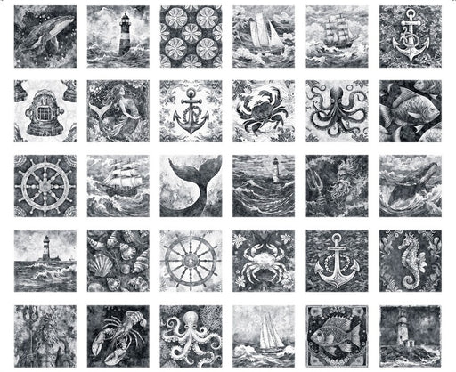 Ocean Blues Panel - Nautical Motif Patches Charcoal
