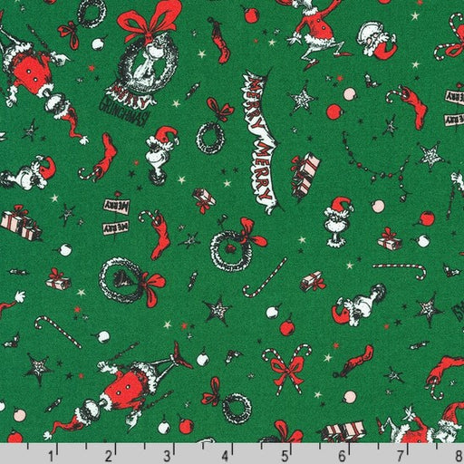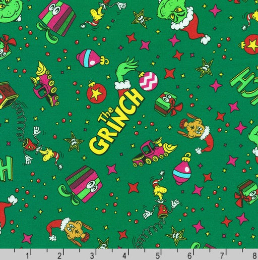 Robert KaufmanOriginal price $4.49 - Original price $4.49Original price$17.96 per yard$4.49 - $4.49Current price $17.96 per yard| /12.75 yards in stockChristmas Grinch novelties tossed on an evergreen background.