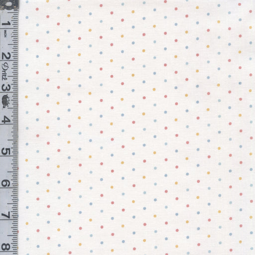 Pastel polka dots tossed on a white background.