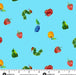 The Very Hungry Caterpillar & fruit tossed on a bright blue background.