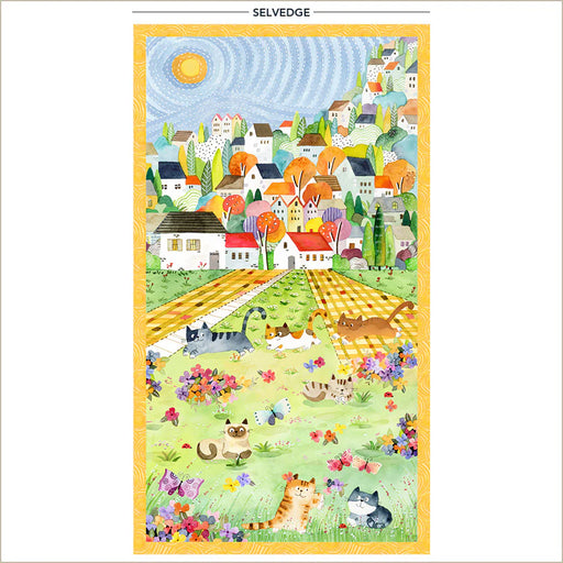 Neighborhood cats panel on a multi colored background. 2/3 yard panel.