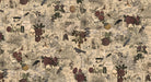 Vintage haunted mansion print on a tan/multi colored background.
