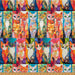 Large geometric patchwork cats on a radiant multicolored background.