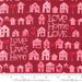 Little houses & hearts on a cranberry background.