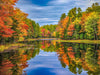 This digitally printed cotton fabric captures the serene beauty of a fall landscape, where vibrant autumn foliage reflects perfectly in a tranquil lake. The design showcases a symmetrical scene with trees in shades of red, orange, yellow, and green, creating a vivid and peaceful atmosphere ideal for various creative projects, from fashion to home decor.