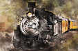 This fabric panel showcases a digitally printed design of a vintage steam locomotive, complete with detailed features like the number 480 on the front, and a realistic depiction of smoke and steam. The artwork captures the essence of an old-world train journey, with the locomotive pulling several passenger cars, all set against a softly blurred background that emphasizes the train's prominence. The intricate details and the nostalgic theme make this fabric perfect for projects that require a touch of historical charm.